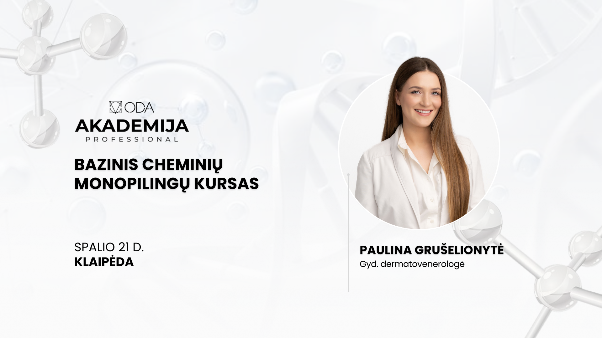 Teorinės dalies lektorė: PAULINA GRUŠELIONYTĖ – gyd. dermatovenerologė, kosmetologijos praktikantė, grožio terapijos, medicinos ir injekcijų studijų lektorė, Optimum Derma Aciditate komandos narė, prisidedanti prie produktų kūrybos.
