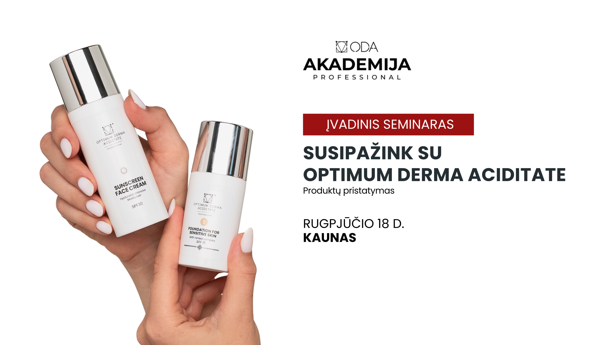 Kviečiame visus kosmetologus į įvadinį seminarą, skirtą susipažinti su profesionalia rūgštine kosmetika Optimum Derma Aciditate. Šis renginys skirtas specialistams, kurie dar nedirba su šiuo prekės ženklu, tačiau nori sužinoti daugiau apie jo veikimo principus, produktų sudėtis ir galimybes praktiškai taikyti procedūras klientų odos būklės gerinimui.